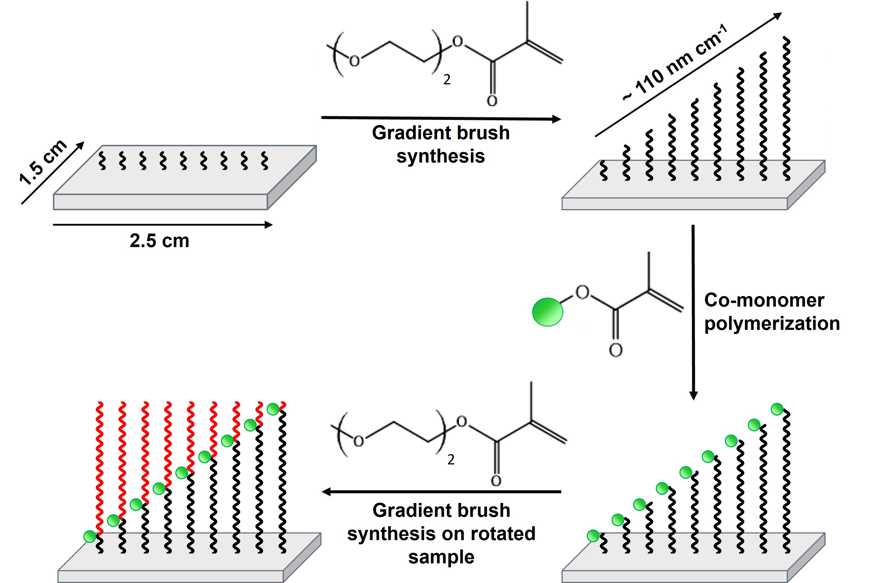 In the SPP project, we develop polymer brush architectures to be able to study the dynamics of wetting by analysing the fluorescence dynamics of a solvatochromic reporter dye. Specifically we focus on poly(di(ethylene glycol) methyl ether methacrylate) (PDEGMA) brushes with an overall uniform height, containing a solvatochromic dye, which is able to probe the local polarity in its vicinity [1]. This dye should be covalently attached to the brushes in a one-dimensional depth gradient, which allows one to image the wetting dynamics with confocal fluorescence microscopy both with high lateral as well as significantly enhanced axial resolution. In this contribution we focus on the details of the synthesis and characterization PDEGMA brushes. Gradient brushes [2] were successfully synthesized via surface-initiated activator regenerated by electron transfer, atom transfer radical polymerization (SI-ARGET ATRP) with inverse gradient directions exploiting two consecutive polymerizations in which the substrate is immersed for different times in the polymerization solution. This was realized by pumping the corresponding solution into a reactor, in which the substrates were placed vertically. In this contribution, details on the polymerization of linear gradient brushes with dry thicknesses from 50 nm up to 400 nm, the addition of a thin second block by conventional atom transfer radical polymerization (ATRP) of a different monomer on top of the gradient brushes and the final gradient brush polymerization with inverse direction as third block to obtain an overall uniform height with a reinitiation efficiency > 80% will be presented. The middle block may contain the reporter dye moieties. The samples were characterized after each step of this block copolymer brush synthesis by ellipsometry, X-ray photoelectron spectroscopy (XPS), infrared (IR) spectroscopy, static and dynamic contact angle measurements and atomic force microscopy (AFM). In the future the incorporation of dye methacrylates into the gradient brush architecture will be attempted, to finally investigate the wetting dynamics of these polymer brush systems.