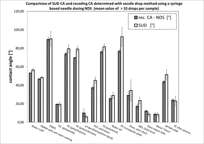 We elucidate the crucial dosing parameters necessary to ensure that the contact angle of SUD accurately represents the recently receded contact angle and compares favorably to classically determined dynamic receding contact angles, as depicted in Figure 2. Furthermore, we provide real industrial application examples wherein this straightforward method of receding CA measurement could address production problems hitherto unresolvable with classical (advancing) contact angle measurements.