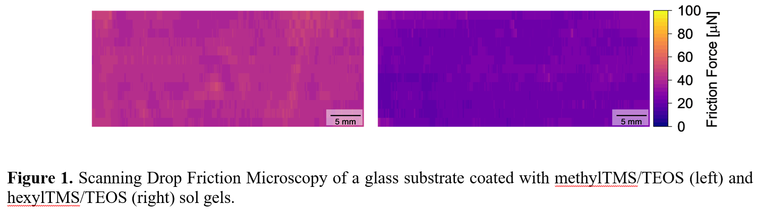 The advancement of renewable energies is crucial in an age in which we are confronted with growing climate and environmental challenges. Solar energy is considered a highly promising, efficient and environmentally friendly source of energy. However, solar panels lose a significant amount of efficiency due to soiling [1]. Thus, a lot of water (more than 35 billion liters per year) is required to keep the panels clean [2]. Hydrophobic coatings that reduce water consumption by promoting self-cleaning via natural rainfall are of high interest. Further desired properties for solar panel coatings are high transparency and mechanical robustness. Our approach is to prepare a hydrophobic, transparent and mechanically stable prototype material by a sol-gel process based on tetraethyl orthosilicate (TEOS) and an alkyl trimethoxysilane (alkylTMS). Here, we vary the alkyl chain lengths (methyl, propyl and hexyl) and precursors’ solid weight ratios. The resulting coatings have a transparency of around 90%, comparable to those of plain glass. With increasing alkyl chain length and concentration, we obtain increasing hydrophobicity with contact angles higher than 90° and hysteresis of around 10°. For the evaluation of self-cleaning features, scanning drop friction force microscopy (sDoFFI) was utilized. Here, lower drop friction force correlates to better self-cleaning properties. Drop friction decreased with increasing alkyl chain length and concentration. For fixed methylTMS/TEOS and hexylTMS/TEOS ratios, a respective average friction force of 41±2 µN and 23±2 µN was observed at a drop volume of 5 µL. Moreover, this technique enables the characterization of coating homogeneity. A thoroughly uniform frictional force was observed on the respective surfaces (Figure 1). Our methods thus enable the production of transparent, uniform and hydrophobic surfaces whose suitability as solar cell coatings can be investigated by sDoFFI.