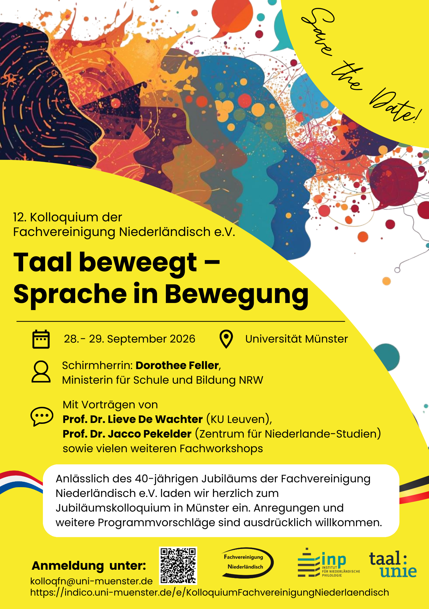 Im Jubiläumsjahr findet das Kolloquium am 28. und 29. September 2026 unter dem Titel „Taal beweegt – Sprache in Bewegung“ in Zusammenarbeit mit dem Institut für Niederländische Philologie der Universität Münster statt.